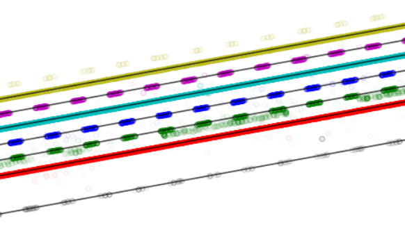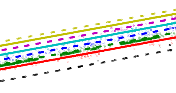 Finally we can use RANSAC once again, this time on each separate cluster of points to provide our final simplified line representation of the set of lanes. Figure 7 shows these lines overlayed on the clustered lane marking points used to create them.