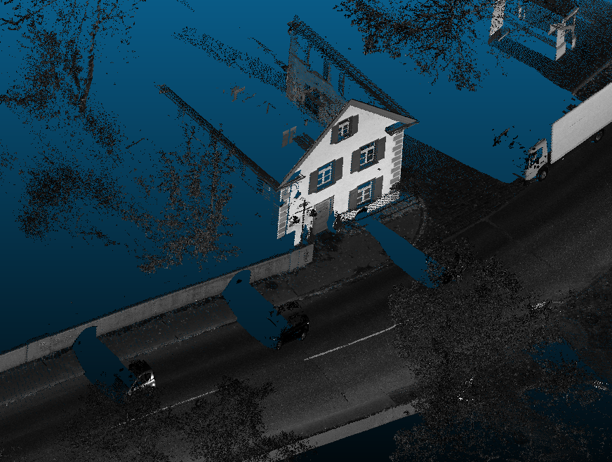 Figure 2 shows a more complex case. This dataset was taken on a section of public road. Here there are a great deal more observations further from the road surface. You can see buildings and trees, as well as other roadside furniture.