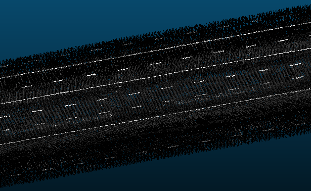 I thought it would be useful to take a quick look at a couple of typical geo-referenced pointclouds used as input. Figure 1 shows one of the simpler cases taken from a straight section of an automotive proving ground. The points are coloured black to white according to the reflectance value of the point return recorded by the LiDAR. The road markings record high reflectance values as they are designed to be seen clearly by vehicles headlights, we can leverage this later.