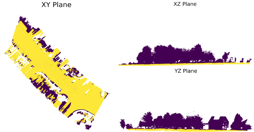Figure 3 shows the points fitted to the ground plane in yellow and the excluded points in purple. You can clearly see the separation of LiDAR observations lying on the ground and those on trees and buildings.