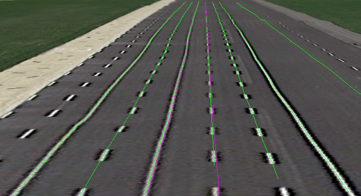 We can make a comparison with aerial imagery, provided here by Google Earth, in figure 8. The green lines in the figure are those generated by the processing method given here, whereas the magenta line was created using an RTK GNSS survey of the right hand side of the lane marking it lies on.