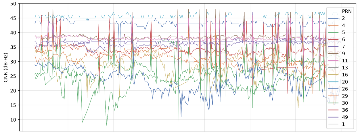- Plot the data and look for step changes in CNR that coincide with one of these events. It’s usually best to focus on the best 3-5 satellites when doing this