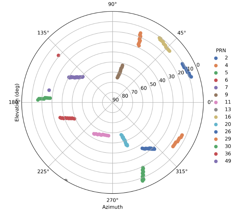 I have provided a couple of example plots showing both time series CNR data, figure 7, and constellation positions, figure 8, as available from the NMEA GSV messages. When looking at these numbers it is important to keep in mind that dB-Hz is a logarithmic scale. Note that the observations that show up close to the horizon in figure 8 often have the lowest CNR (greatest noise) in figure 7. This is due to those signals typically traveling through more atmosphere and ionosphere due to there low elevation angle.